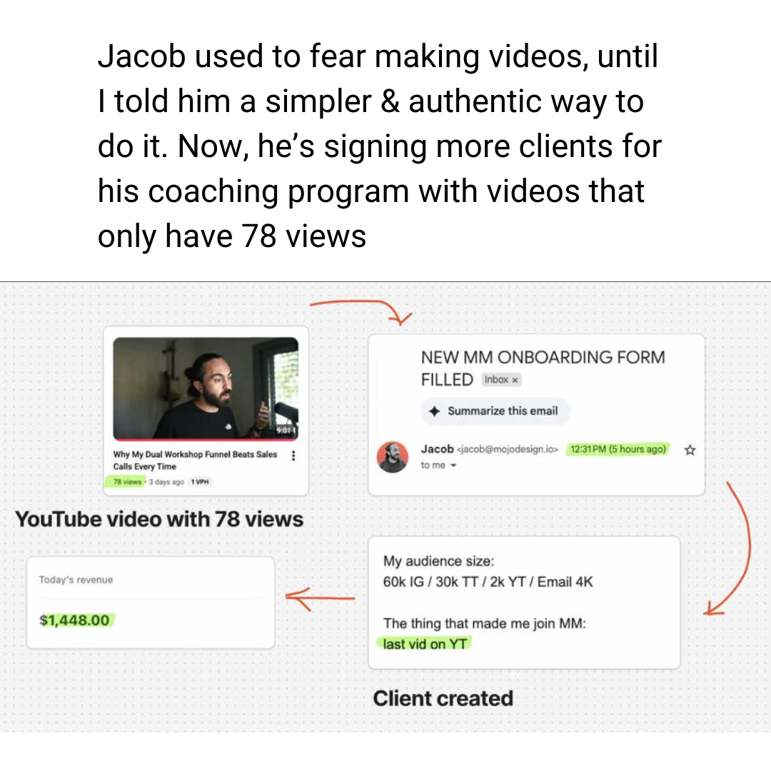 We’ll keep you accountable, and connect your channel to a simple funnel - so your videos start opening doors to clients, collaborations, and opportunities.
